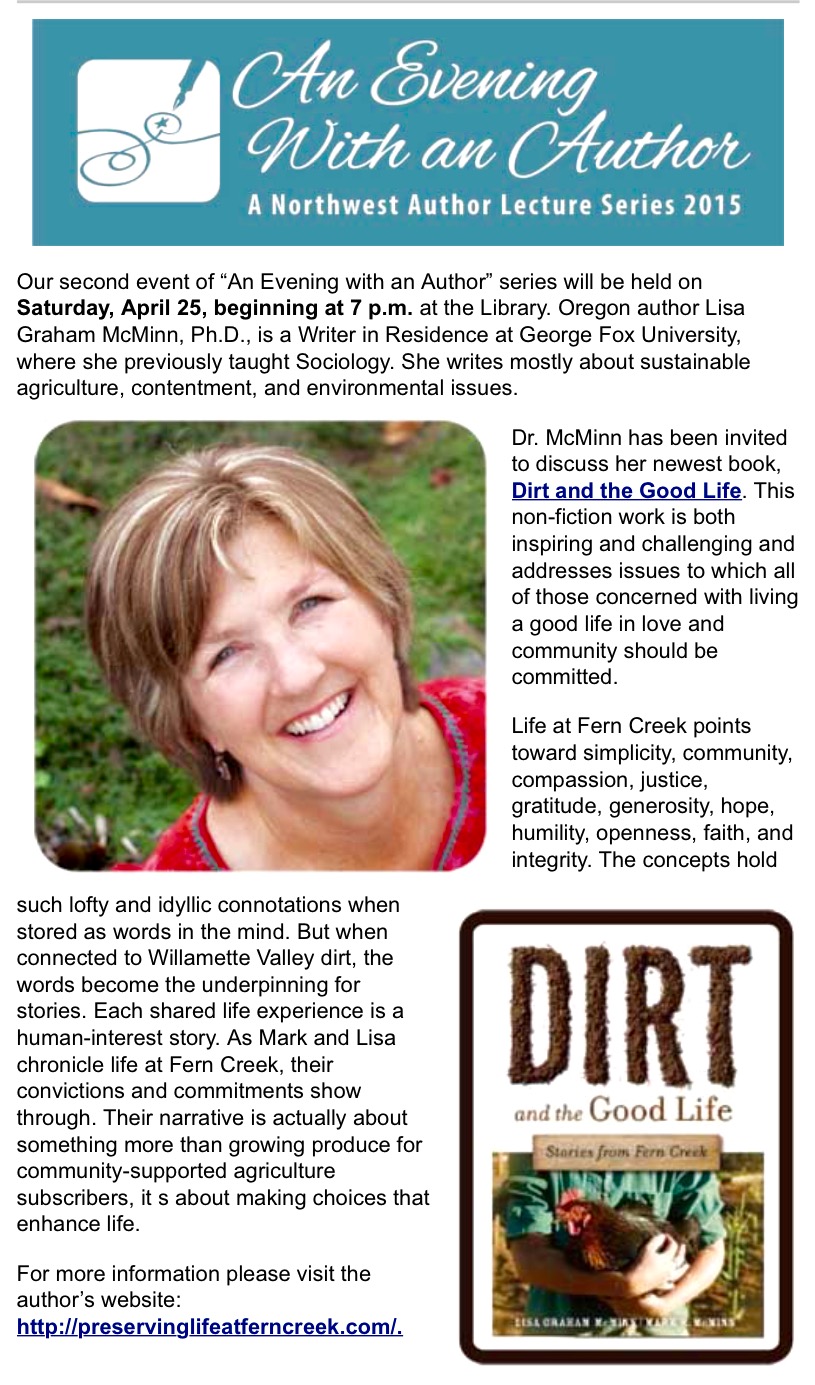 Spend an evening with farm author Dr. Lisa Graham McMinn who will be discussing her newest book “Dirt and the Good Life” Saturday,April 25th,7:00 p.m. at the North Plains Library